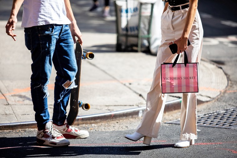 A pedestrian carries a Victoria’s Secret shopping bag while waiting to cross a street in New York.Demetrius Freeman / Bloomberg via Getty Images file