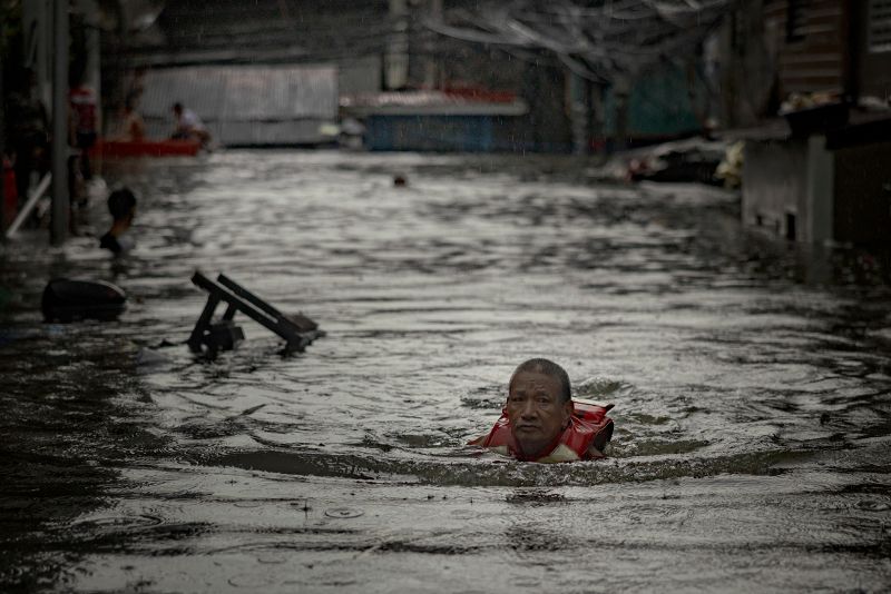 Video and images from Manila show people wading through chest-deep water and some clinging precariously to overhead power lines as major roads turned into rivers. Families with children wrapped in towels or plastic ponchos huddled together on dinghies as disaster response teams rescued them from flooded houses.